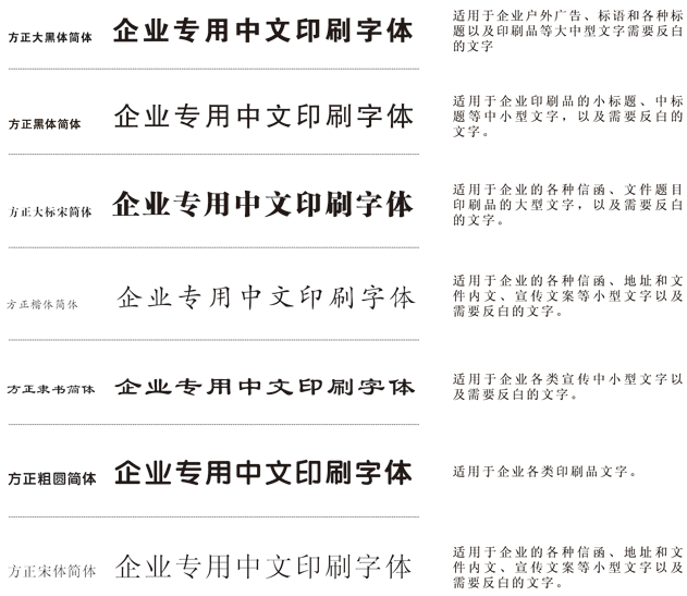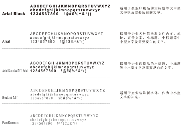 為使視覺形象更加統一,所有傳媒所用文字,均應選用以下規定字體。字體允許向右傾斜20度,允許長體90%―100%,扁體110%-120%。禁止使用其他字體,特性情況(如節日、慶典)設計例外。同時,為求得運用方便,在刊物,媒體及封面的排版上,若無相同字體時,可選擇字形相近的字體替代使用。